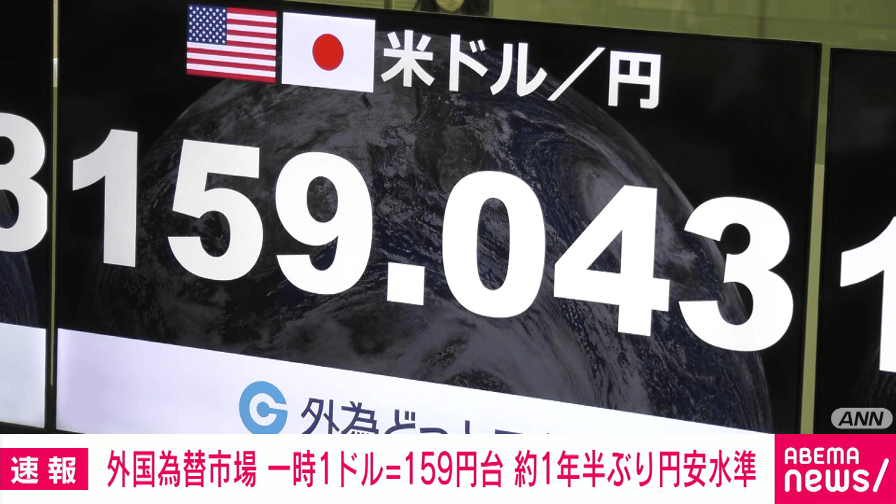 日テレNEWS NNN外国為替市場で円安が加速し、一時1ドル=159円台をつけました。2024年7月以来およそ1年半ぶりの水準です。