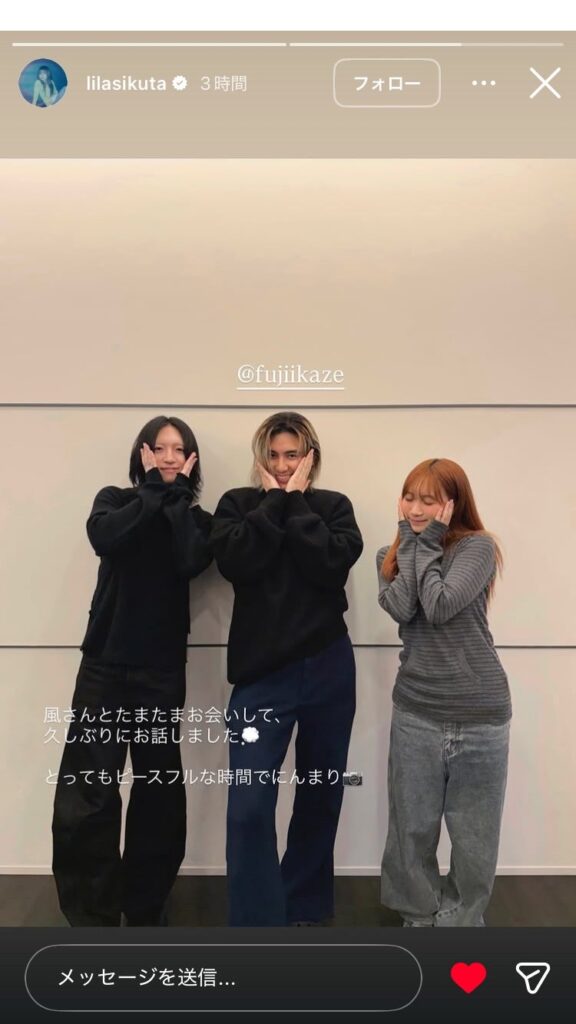 Ayaseは「風くんとばったり」とつづり、シンガー・ソングライターの藤井風、メンバーのikuraこと、幾田りらと3人で顔に手を当てるポーズのショットを投稿したもの。