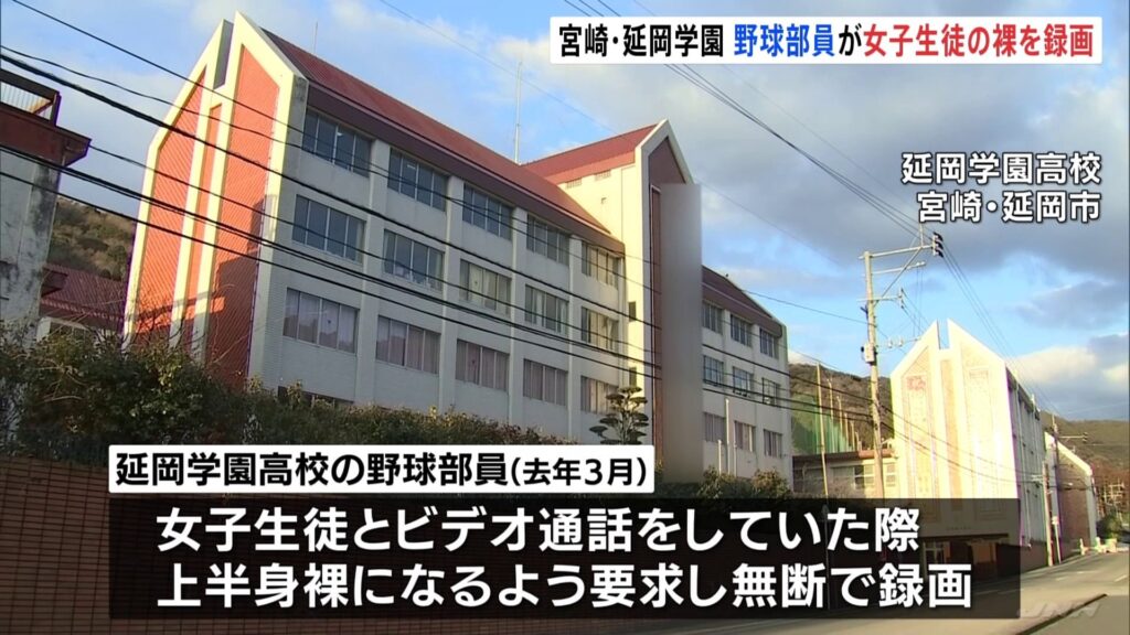 共同通信夏の甲子園大会で準優勝経験のある延岡学園高(宮崎県延岡市)の野球部員が昨年、女子生徒とのビデオ通話で裸になるよう求め動画を作成したとして、児童買春・ポルノ禁止法違反の疑いで家裁送致されていたことが17日、同校や宮崎地検への取材で分かった。