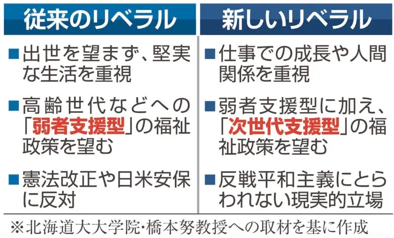 北海道大大学院の橋本努教授(社会経済学)によると、新しいリベラルとは、従来のリベラルが訴えてきた高齢者らへの「弱者支援」よりも、教育や女性活躍など多様な分野に予算を投入する「成長支援」を求める層を指すという。