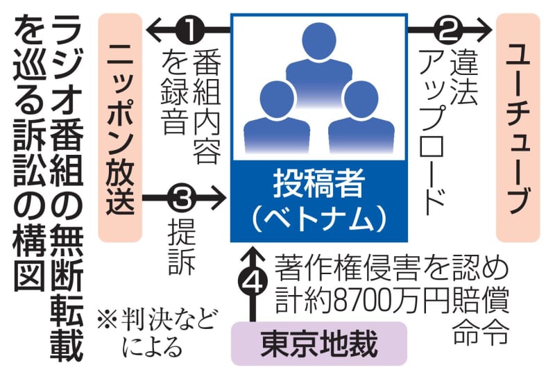 ラジオ番組の内容を無断で動画投稿サイト「ユーチューブ」に転載されたとして、番組を制作したニッポン放送(東京)がベトナム在住の投稿者3人に損害賠償などを求めた訴訟で、東京地裁(中島基至裁判長)が投稿を違法と認め、請求通り動画削除と計約8700万円の支払いを命じる判決を言い渡したことが24日、分かった。昨年12月4日付で、ユーチューブは既に動画を削除した。