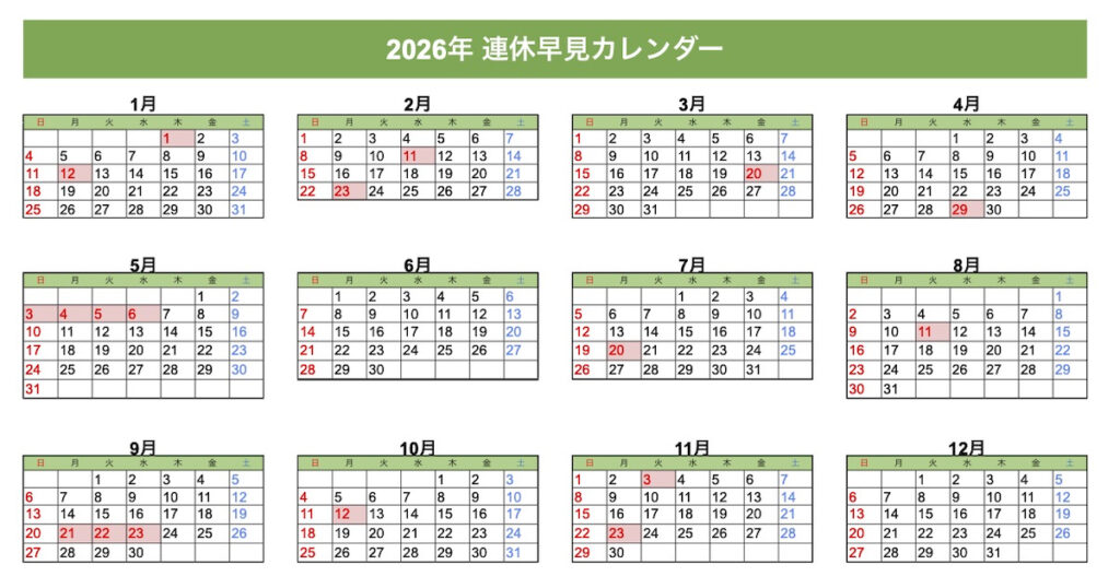 4月末から5月上旬の、いわゆるゴールデンウイークでは4月30日(金)を休みにできれば、4月29日(木)の昭和の日から5月5日(水)のこどもの日までの7連休を取ることも可能な日程になっています。