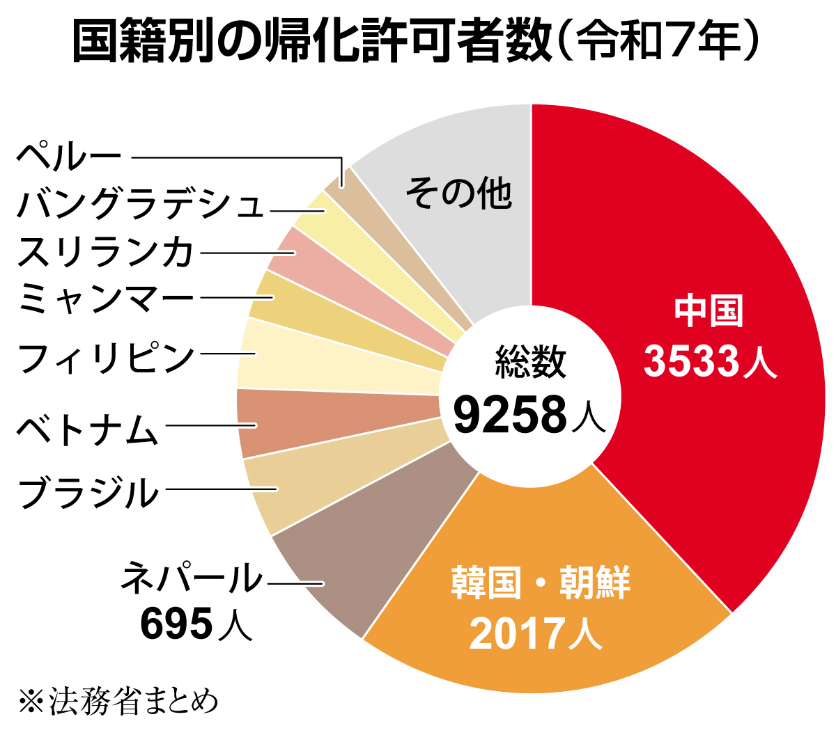 令和7年1年間に外国人が日本国籍を取得した帰化許可者数は約9200人で、このうち中国からが約3500人と最も多く、国籍別で2年続けて最多だったことが、法務省のまとめでわかった。一方で、帰化許可の申請者は年間約1万4千人となっている。
