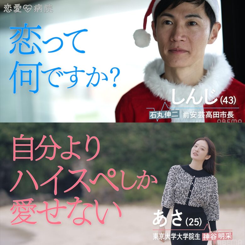 石丸氏にとっては、初の恋愛リアリティーショー出演となる。紹介VTRでは、石丸氏がサンタクロースのコスプレをして「恋とはなんぞやという定義から始めねばならぬ」と意気込んでいた。他にも「赤の他人じゃないですか」と語る場面もあった。そして動画の最後、石丸氏は「愛してる」と告白するシーンで終了していた。
