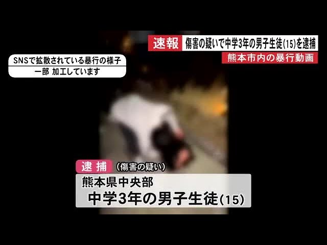 1: どどん ★ 2026/01/16(金) 14:51:35.72 ID:poMeq8MI9熊本市で、10代の少年に対し暴行を加え、けがをさせたとして、警察は16日、熊本県在住の男子中学生(15)を傷害の容疑で逮捕しました。