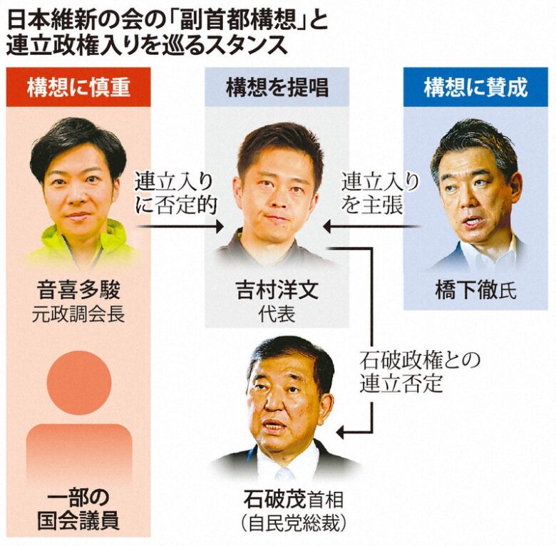 維新は自民に対し、副首都機能整備法案を来年の通常国会で成立させるよう求めている。9月末にまとめた法案骨子では、目的は東京一極集中を是正し、災害時に首都機能を代替するほか、東京圏とは別の経済圏をつくり、日本の成長を牽引(けんいん)するとした。実現に向けた特例措置として、国から税源を移譲▽首都機能の代替に必要なインフラ整備のための財政措置▽国会や中央省庁の機能の一部移転―を挙げた。