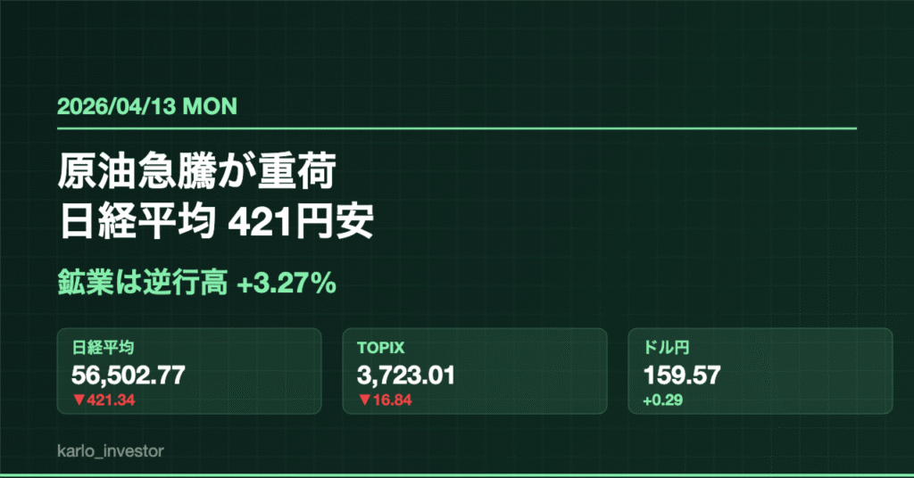 【速報】日経平均 421円安の5万6502円で取引終了 米イラン協議が合意至らず売り注文広がる 「トリプル安」展開に