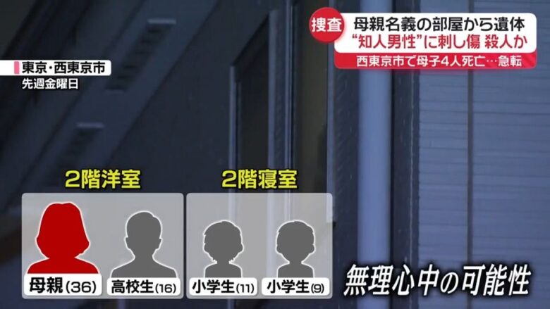 2025年12月24日(水) 11:45東京・西東京市の住宅で母親と子どものあわせて4人が死亡した事件。その後、別のマンションの一室で死亡しているのが見つかった知人男性の携帯電話が、母親の車の中から発見されたことが新たに分かりました。