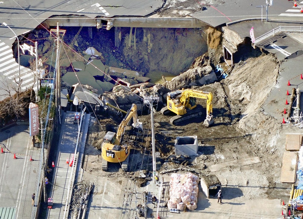 穴の深さは約15メートルあり、底から8メートルの高さまで土砂やがれきが 堆積たいせき している。穴につながるスロープは幅が約4メートル、長さが約30メートルで、県は1月30日午後から造成を進めていた。