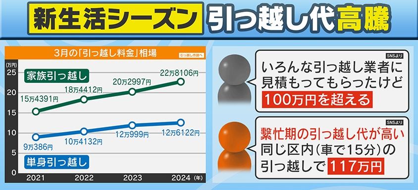 繁忙期である去年3月の引っ越し料金は、単身だとおよそ14万円、家族だとおよそ24万円で、5年前と比べて1.5倍に上昇しています。今年も同じ水準か、さらに上がることが予想されています。