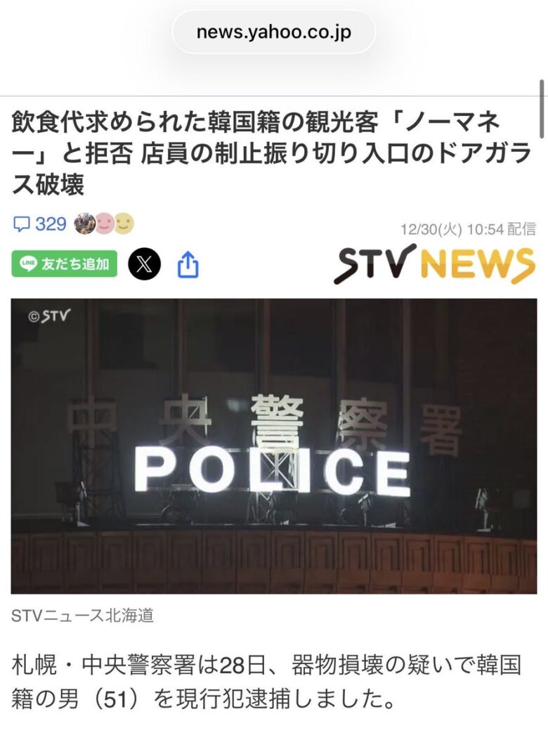 【札幌】飲食代求められた韓国籍の観光客「ノーマネー」と拒否 店員の制止振り切り入口のドアガラス破壊