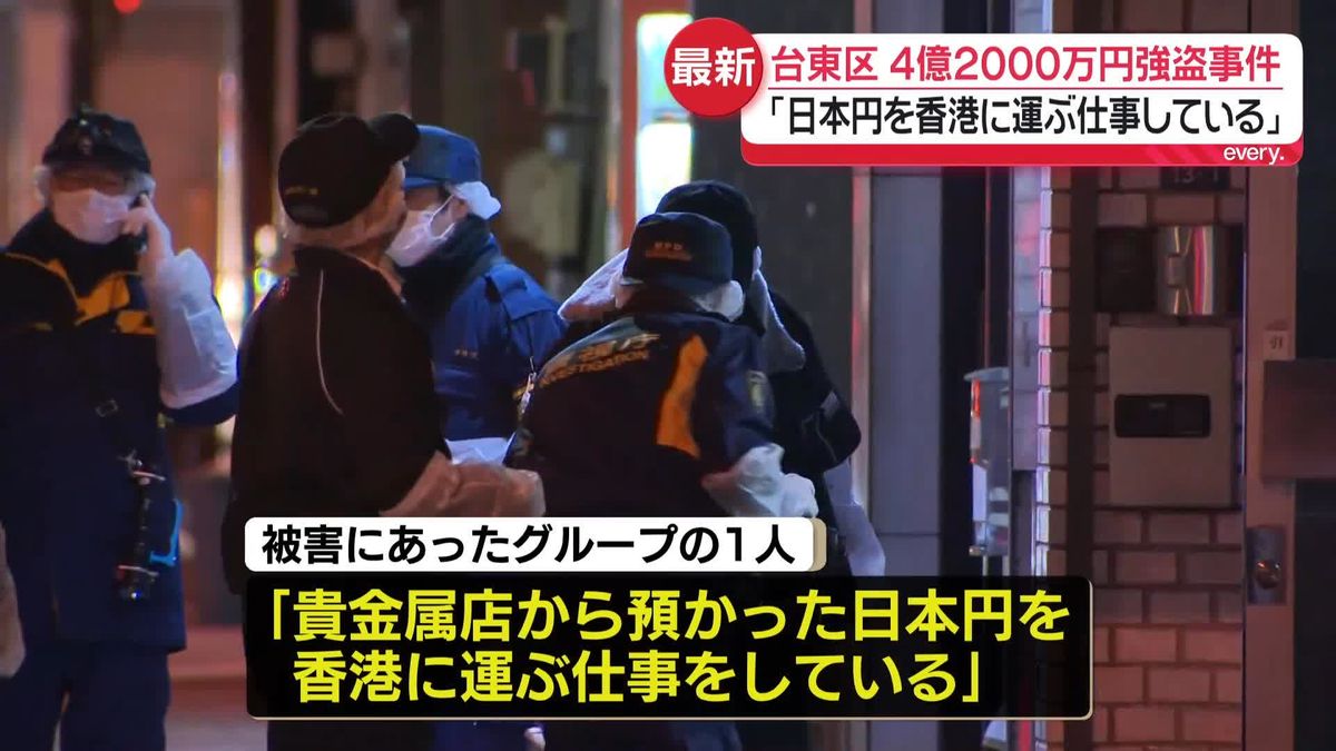 共同通信東京都台東区東上野の路上で約4億2千万円が入ったとされるスーツケースが奪われた事件で、被害者の1人が「貴金属店から預かった日本円を香港に運んで両替する仕事だった」と説明していたことが31日、捜査関係者への取材で分かった。警視庁暴力団対策課は、現金が運搬される情報を事前に把握した何者かによる計画的な犯行とみて調べる。
