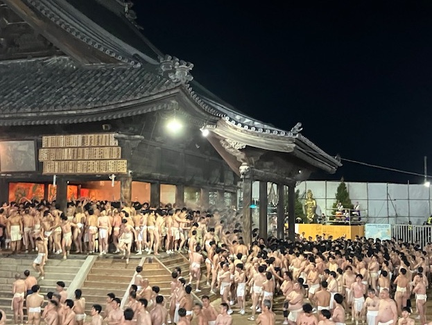 西大寺会陽は室町時代から続き500年以上の歴史を持つ裸祭りで、国の重要無形民俗文化財に指定されています。午後10時に本堂の2階から投下される、2本の宝の木、「宝木」の争奪戦が行われ、主催者によりますと約1万人が参加しました。