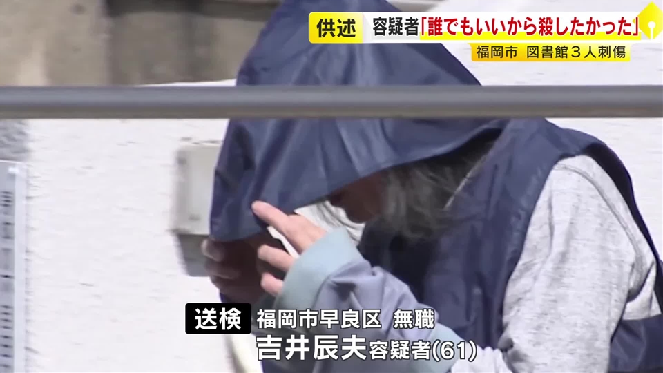 福岡市早良区の市総合図書館で男女3人が刺されるなどした事件で、殺人未遂容疑で逮捕された無職、吉井辰夫容疑者(61)=同区西新5=が「約2年前に仕事を辞めた後、貯金を取り崩して生活をしていたが、現金が底を突いた。生活が苦しく、どうでもよくなり、誰でもいいので殺したかった」という趣旨の供述をしていることが捜査関係者への取材で判明した。