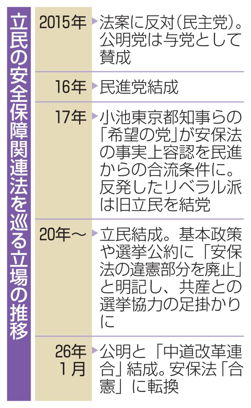 民進は民主党当時の15年、法案に反対した経緯があり、小池氏に反発したリベラル派は旧立民を結党。20年に現在の立民を結成した後も、基本政策や選挙公約に「違憲部分の廃止」を盛り込み、「全面廃止」を掲げる共産党と選挙協力する足掛かりになった。