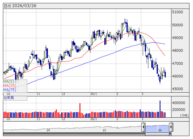 イランは米国の示した和平計画を拒否し、5項目の条件を米側に逆提案した。トランプ米大統領は米東部時間26日朝、イランに対して「手遅れになる前に早く真剣になった方がいい」と自身のSNSに投稿した。双方が歩み寄る様子がみられず、停戦交渉が進展するとの期待が後退して売りが優勢になった。