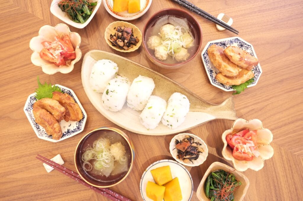 食卓におにぎりや唐揚げが並ぶショットをアップ。「春の七草おにぎり 車麩のから揚げ ほうれん草のおひたし トマトの甘ポン和え 五目ひじき かぼちゃ煮 鶏だんごと大根のスープ」と紹介した。