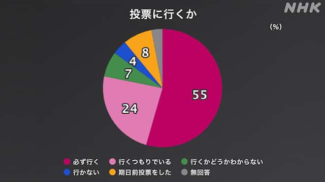 1: 蚤の市 ★ 2026/02/02(月) 19:49:36.38 ID:Qovijyv49NHKが行った世論調査で、2月8日に行われる衆議院選挙の投票に「必ず行く」と答えた人は、「期日前投票をした」という人とあわせて63%で、公示前に行った先週の調査と比べて5ポイント高くなりました。