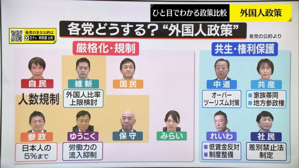 1: 蚤の市 ★ 2026/02/04(水) 07:55:41.34 ID:WUTg0ukF9昨年の参院選に続いて、今回の衆院選(8日投開票)も外国人政策が争点の一つになっている。中でも各党で意見が割れているのが、外国人の受け入れ人数や人口に対する外国人比率に上限を設ける「総量規制」の導入の是非だ。