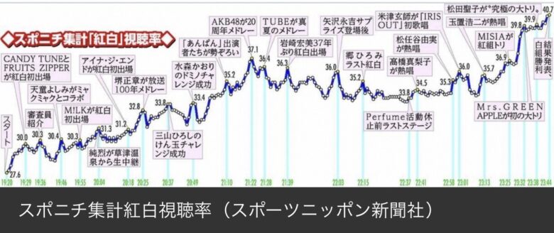 紅白は前回からターゲット層を中高年にシフトさせたことが、功を奏している。2年連続で平均視聴率を上げたことから、この傾向は続くとみられる。番組関係者は「その年のヒット曲を歌えば視聴率が上がる紅白ではなくなってきた。中高年に響く往年のヒット曲をどれだけ届けられるか」と今後の見通しを示した。