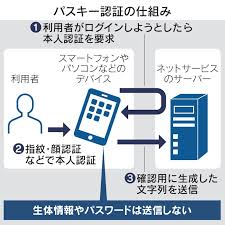 パスキーは、世界のIT大手でつくる業界団体「FIDO(ファイド)アライアンス」の規格に基づく認証方式だ。利用者の端末とインターネットサイト事業者のサーバーに電子的な「鍵」を別々に保管し、利用者はスマートフォンなどにひも付けられた指紋認証や顔認証などでログインする。パスワードを使わないため、漏えいのリスクが少ないとされる。