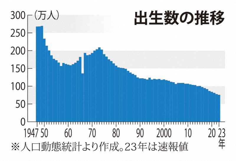 24年は外国人を除く出生数が68万6173人(確定値)で、1899年の統計開始以降初めて70万人を下回った。25年はさらに減少する見込み。