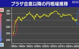 憤まんニュース【NHK特集】米国の「貿易赤字」是正のため、1ドル=150円から95円に 「プラザ合意」40年前の猛烈な円高、再来あるか ★2 1: お断り ★ 2025/09/29(月) 07:23:13.22 ID:UoJuUDwB940年前の猛烈な円高 再来はあるか【経済コラム】1ドル=約150円(現在の水準)の円相場が1年後に95円前後になったら…。ドル高の是正を目指した1... 2025.09.29憤まんニュース